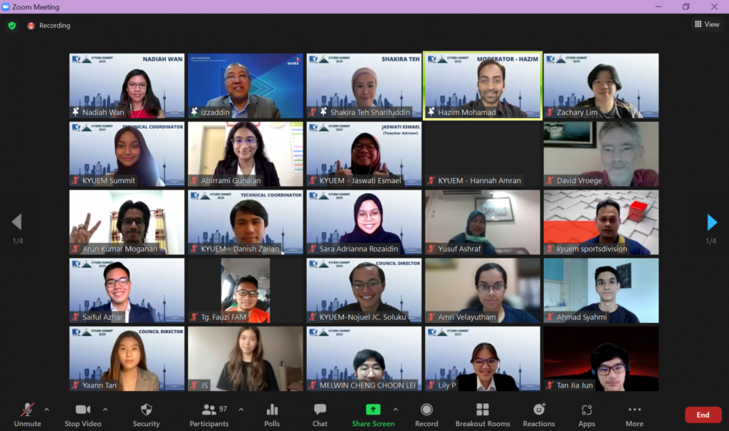 The pandemic has hindered the organisation of physical events from world conferences to school graduations. Nevertheless, that did not stop the KYUEM Summit team from conducting their first KYUEM Summit online. With the theme, Malaysia Unbounded: A Vision of Resilience, this year’s summit consisted of five councils, Economics, Social Policy, Exclusive Council, Politics and Science and Technology. The summit also had a Panel Symposium moderated by Hazim Mohamad, KYSER Class of 2010, who co-founded the KYUEM Summit back in 2012.
